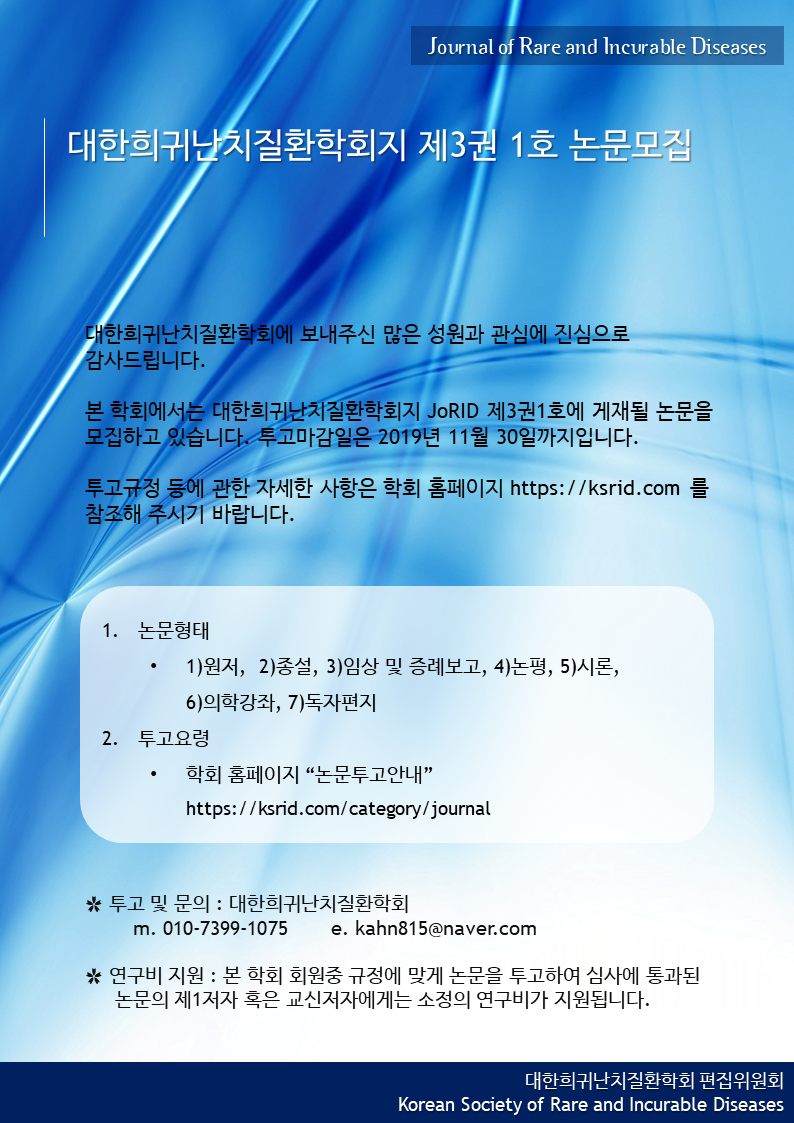 대한희귀난치질환학회지 제3권 1호 논문모집공고
